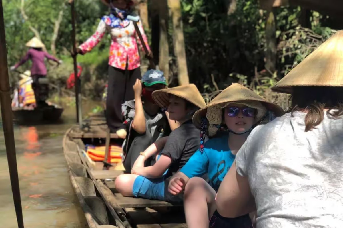 Mekong Delta Cruise – Boat trip through riverside villages and floating fish rafts.